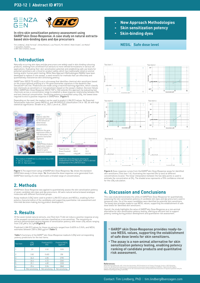 GARD®skin (OECD TG 442E) is an in vitro assay that identifies chemical skin sensitizers based on the transcriptional profiling of a 196-gene biomarker signature in the dendritic-like SenzaCell® cell line. Predictions are made using a machine-learning algorithm, which classify test chemicals as sensitizers or non-sensitizers based on the assay’s readout, Decision Values (DVs). GARD®skin Dose-Response (OECD TGP 4.106) extends this approach by evaluating test chemicals across a concentration range to establish a dose-response relationship between DVs and test chemical concentration. Sensitizing potency is quantified using cDV0, the lowest dose required to elicit a positive response in GARD®skin. Depending on the need, the readout can be used to predict LLNA EC3 values, No Observable Effect Levels (NOELs)/No Expected Sensitization Induction Levels (NESILs), Human Potency (HP) Categories, and UN GHS/CLP classification (1A or 1B), all with high statistical significance.