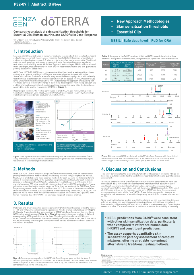 This study evaluates the utility of GARD®skin Dose-Response to predict NESILs for EOs, bridging the gap between hazard identification and quantitative risk assessment. Three EOs (A, B, C) were analysed using GARD®skin Dose-Response. Their skin sensitization potency threshold levels were estimated by the assay readouts (cDV0) and NESIL predictions. Results were compared to existing murine (LLNA EC3) and human (HRIPT/HMT) data through weight-of-evidence analysis.